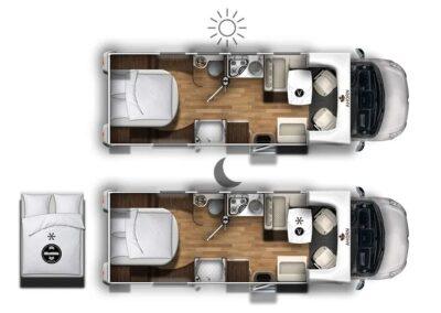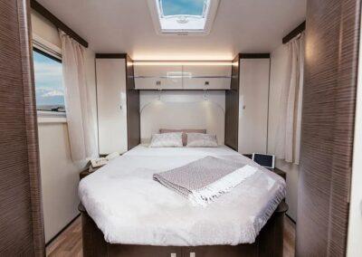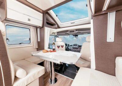 La serie Alaska fue equipada con los elementos de diseño más modernos e impresiona por su elegante interior, que incluye una variedad de elementos LED. La zona trasera, separada por una puerta corredera, también tiene un diseño óptimo. Gracias a la iluminación LED integrada y al cabezal de ducha extra grande, se puede disfrutar de la comodidad de un interior de baño elegante y funcionalmente bien pensado. Las cocinas de la serie cuentan con campana extractora eléctrica, protección contra salpicaduras y grandes cajones que ofrecen suficiente espacio para los utensilios de cocina. La mesa de comedor se puede desplegar a voluntad y ofrece a 5 personas la máxima comodidad para comer. Se puede pedir un techo frontal panorámico (techo de cielo) como opción para los tres modelos. Esto crea una sensación de espacio espaciosa y luminosa.