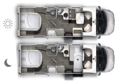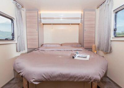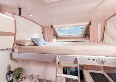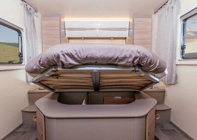El modelo Canada TQ equipado en la parte trasera con una cama en isla, ofrece la comodidad de dormir como en un hotel. El comedor en convertible, generando un lugar adicional para dormir. Opcionalmente se pueden añadir plazas de pernocta añadiendo al equipo la cama eléctrica elevable. Una cama ajustable en altura a demanda. Una red de seguridad hace posible que su uso sea adecuado para niños. Durante el día, la cama elevadora se eleva hasta el techo y ofrece dos literas para dormir por la noche en muy poco tiempo. Los modelos perfilados de la serie Canada están diseñados para proporcionar la máximo confort, con el mayor espacio interior posible. Un detalle importante es que el dormitorio se puede separar del resto de la sala de estar por una puerta de madera maciza. Esto aumenta la privacidad y permite dos áreas para dormir separadas. Se puede encontrar suficiente espacio de almacenamiento en los armarios junto a la cama y también debajo de la cama mediante un mecanismo de plegado. Especialmente prácticas son las lámparas de lectura, en las que hay integradas tomas USB.