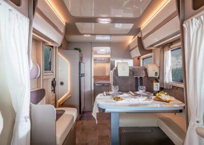 Los modelos de Canadá vienen de serie con ventanas con marco Polyvision, pisos, paredes y techos de PRFV, inodoro y refrigerador tipo cassette Thetford, calefacción de gas Truma y trampillas de techo Heki. Además, en los vehículos se instalan componentes del fabricante de calidad Tecnoform, así como bisagras para muebles Blum. Todas las luces LED pueden atenuarse y controlarse individualmente mediante un sistema electrónico. Esto asegura un ambiente de iluminación adecuado en todo momento. El aspecto de mármol de la mesa y las encimeras de la cocina también realza el espacio habitable. La ergonomía y la calidad de la tapicería de los asientos y los colchones ofrecen el máximo confort.